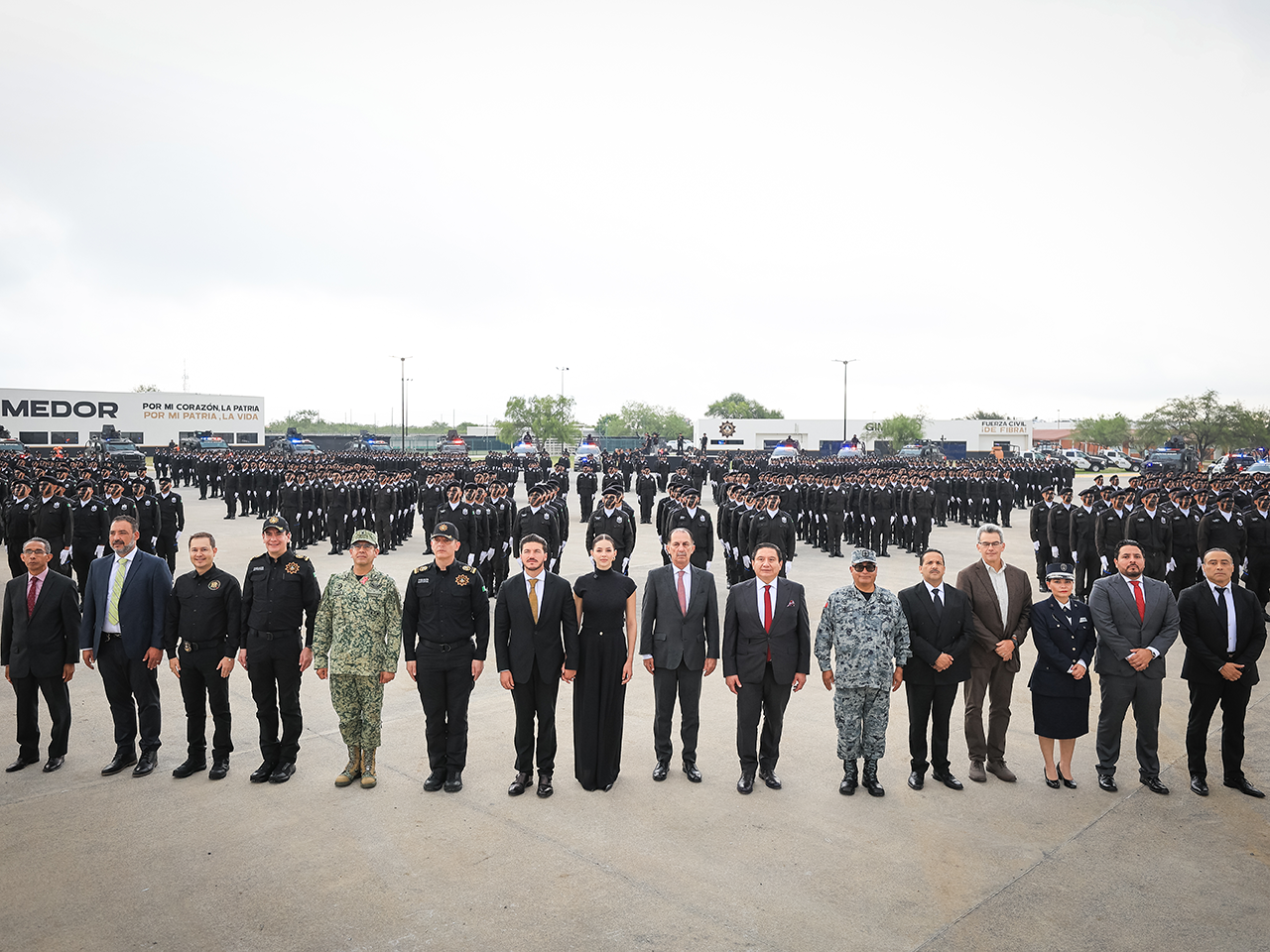 El mandatario estatal, quien estuvo acompañado de Mariana Rodríguez Cantú, felicitó a los graduados y resaltó que el Estado ha logrado salir de la media nacional y ha disminuido de manera importante los índices delictivos gracias a la coordinación con los diferentes niveles de gobierno y el equipamiento con el que cuentan.
