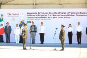 Ciudad Victoria, Tamaulipas. – El gobernador Américo Villarreal Anaya asistió como invitado de honor a la toma de posesión al cargo y protesta de bandera del general brigadier de Estado Mayor, Newton Manuel Chávez Baños, como comandante interino de la 48 Zona Militar.
