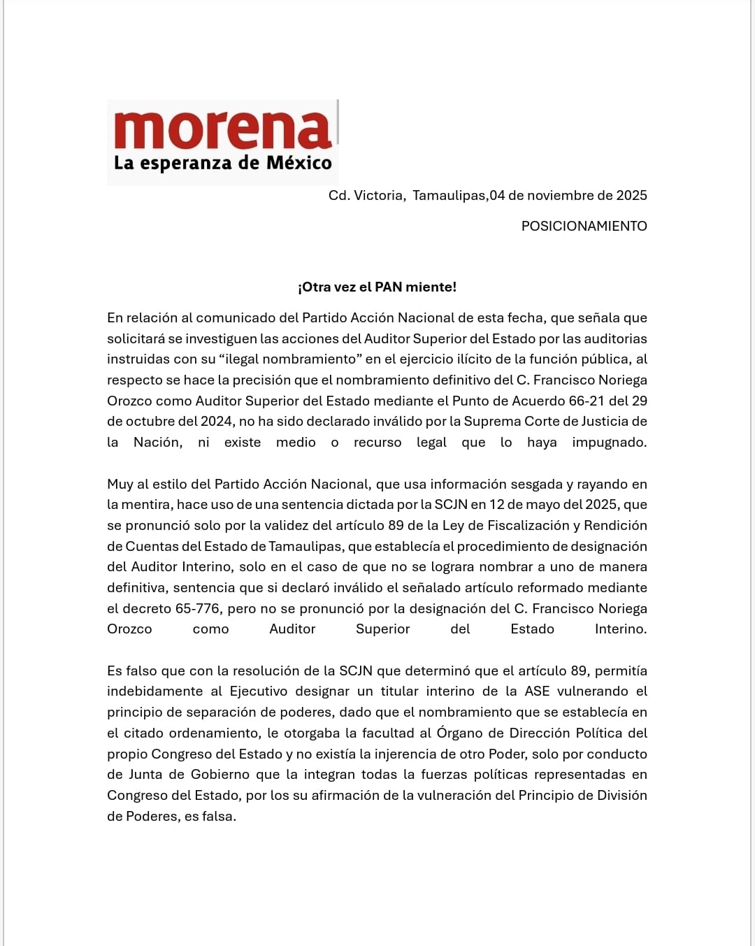 Ciudad Victoria, Tamaulipas. — El Comité Ejecutivo Estatal de Morena desmintió las afirmaciones del Partido Acción Nacional (PAN) sobre un presunto nombramiento ilegal del Auditor Superior del Estado, Francisco Noriega Orozco, al asegurar que su designación es totalmente válida y vigente.