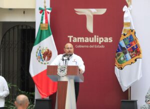 Tras la proyección de un video donde la directora de Protección Civil de Veracruz, Guadalupe Osorno, a nombre de la gobernadora Rocío Nahle da un reconocimiento al pueblo de Tamaulipas, por las labores de auxilio prestadas, el mandatario entregó litografías enviadas por la gobernadora al capitán Marcelo Israel Peña y al técnico auxiliar Fidel Eduardo Castro.