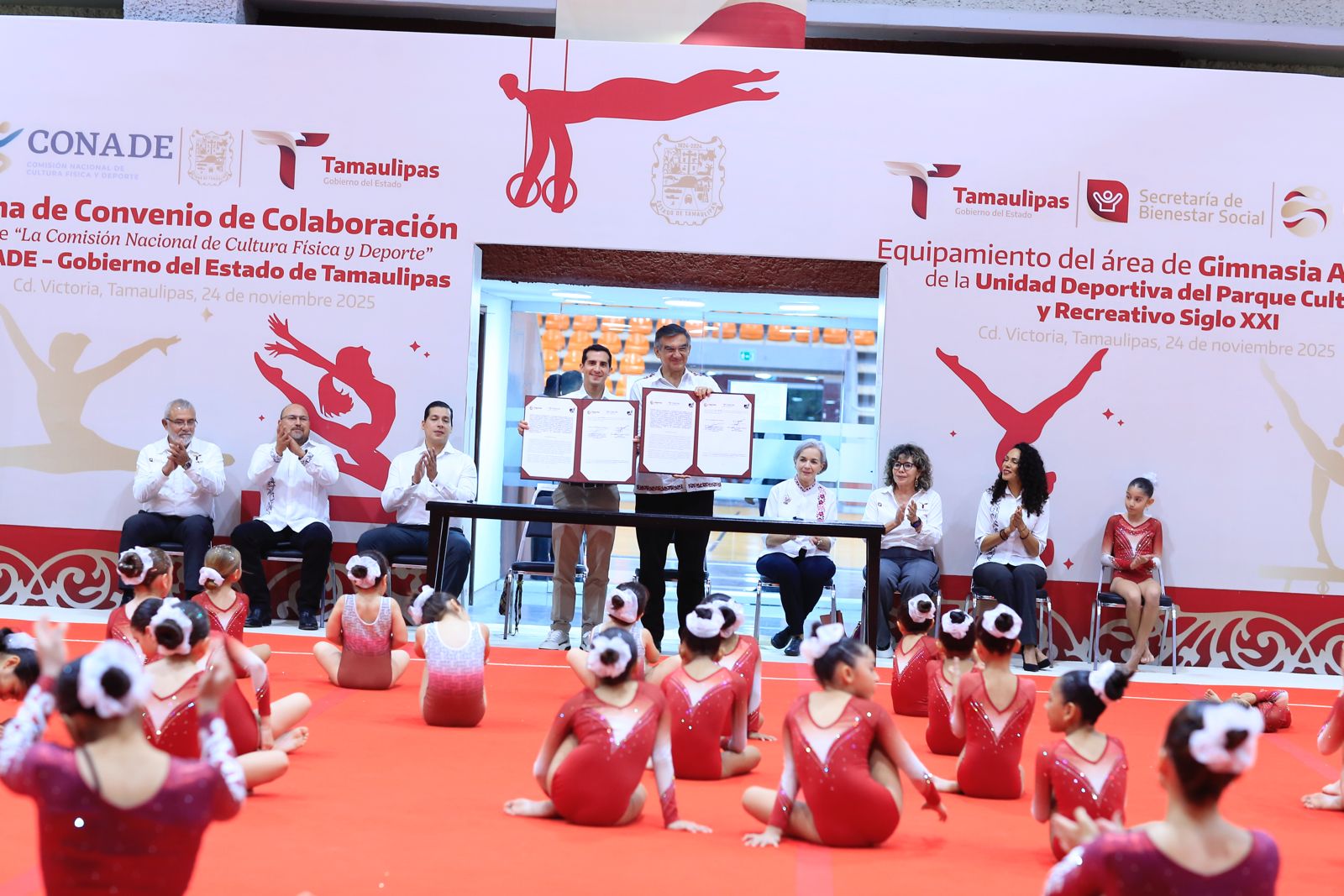 Ciudad Victoria, Tamaulipas.- En el marco de la reinauguración del área de Gimnasia Artística de la Unidad Deportiva Siglo XXI, el director general de la Comisión Nacional de Cultura Física y Deporte (Conade), Rommel Pacheco, y el gobernador Américo Villarreal Anaya firmaron un Convenio de Colaboración para impulsar la promoción y el desarrollo de programas y acciones que fomenten actividades físicas y deportivas.